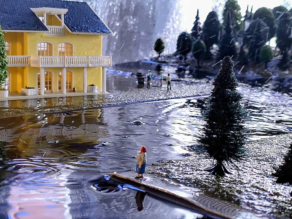 | Das Bild „Starkniederschlag in Miniatur“ von Matthias Brockel (Laboringenieur Wasserwesen) zeigt einen Ausschnitt aus dem Sturzflutmodell, das das IWS – Institut für Wasserbau und Siedlungswasserwirtschaft der HTWK Leipzig bauen ließ. Mithilfe dieses Modells kann das Institut komplexe Strömungsphänomene wie Einstau, Rückstau, Überstau und Überflutung plastisch darstellen. Deshalb ist es bei Studierenden und Gästen sehr beliebt und wird regelmäßig während der Langen Nacht der Wissenschaften gezeigt.