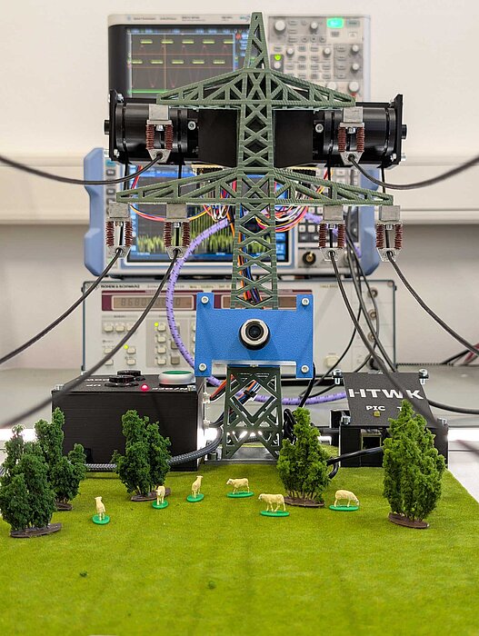 | Das Bild zeigt ein Prototyp im Labor für elektrische Energietechnik für eine Messeinrichtung. Sie soll mit optischen Richtsensoren den Durchhang von Freileitungen erkennen. Es handelt sich um ein Messverfahren für das Freileitungsmonitoring, dass anhand einer kontaktlosen direkten Durchhangsermittlung die tatsächliche Belastbarkeit der Leiterseile aufzeigt, um damit bis zu 80 Prozent mehr Energie über die bestehenden Leitungen zu Übertragen.
