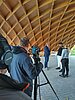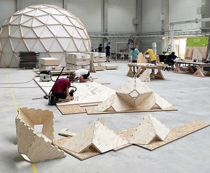 | Das Bild zeigt mehrere Mitarbeiter und Studierende beim Bau einer innovativen Holzskulptur, welche die geometrischen Strukturen eines Pinienzapfens in ein formaktives Schalentragwerk übersetzt. Die dafür entwickelte, auf digitale Fertigung ausgelegte und auf hoher Präzision basierende Prozesskette war nur durch eine gut abgestimmte und ausgewogene Teamarbeit möglich. Denn im Team macht Forschung am meisten Spaß – und gemeinsam geht es schneller.