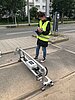 | Das Bild entstand während einer Messkampagne im Rahmen der Machbarkeitsstudie „Laserbasierte Detektion von Lockerungen im Straßenbahngleis – LaDeLok“.