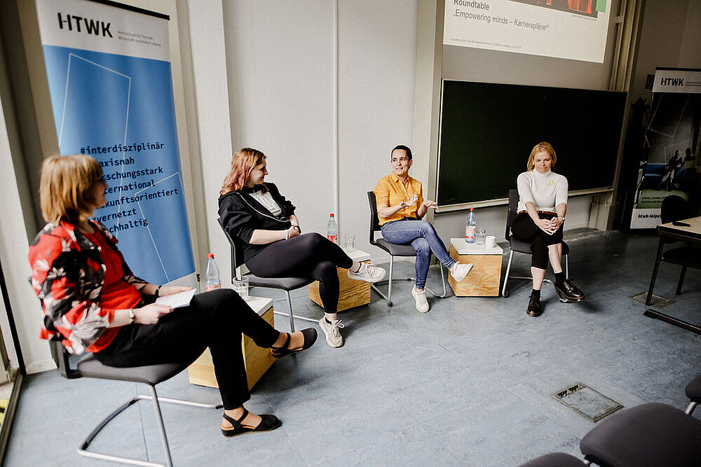 Mit dem Aufruf "Frauen, seid mutig, vernetzt Euch und sucht Verbündete" sprach sich auch Professorin Graßmann (MDC, Berlin) in ihrer Keynote für gegenseitiges Empowerment aus. Unter dem Thema „Empowering Excellence: Frauen im Wissenschaftsnetzwerk“ lud sie die Teilnehmerinnen dazu ein, proaktiv die nächsten Karriereziele anzugehen und sich engagiert den Herausforderungen einer wissenschaftlichen Laufbahn zu stellen. Wie sich der Alltag im Wissenschaftskontext an der HTWK Leipzig real gestaltet und welche unterschiedlichen Perspektiven und Erfahrungen es zum Thema wissenschaftliche Karrierepläne gibt, konnten die Gäste im Anschluss bei der Podiumsdiskussion von (Nachwuchs-) Wissenschaftlerinnen der HTWK Leipzig erfahren.