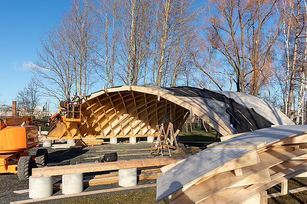 Die Vorfertigung der noch fehlenden 14 Elemente für die Komplettierung des Demonstrator01 ist abgeschlossen! Dabei kam eine Weiterentwicklung des Fertigungs- und Vormontagekonzepts direkt zur Anwendung, welches bei FLEX „on the fly“ aus den Erfahrungen des „1. Bauabschnitts“ entwickelt worden war. Soll heißen: Die Kerto-Platten, welche die Dachschalung bilden, wurden direkt beim deutschen Kerto-ImporteurFH Finnholz auf der hauseigenen CNC-Anlage mit Hilfe eines bei FLEX generierten Datensatzes abgebunden. Alle Platten konnten im Ergebnis hochpräzise schiefwinklig zugeschnitten sowie mit Bohrungen und „minimalinvasiven Markier-Schnitten“ zur Positionierung der Lamellen versehen an unseren Projektpartner STRAB Ingenieurholzbau geliefert werden. Der Entwicklungs- und Abstimmungsprozess mit den Beteiligten nahm dabei ungefähr zwei Monate in Anspruch und ermöglichte, dass die handwerkliche Montage aller 14 Bogendachsegmente innerhalb von nur zwei Tagen abgeschlossen werden konnte.