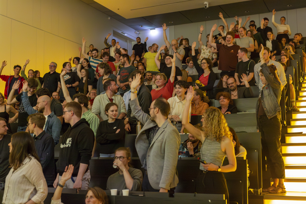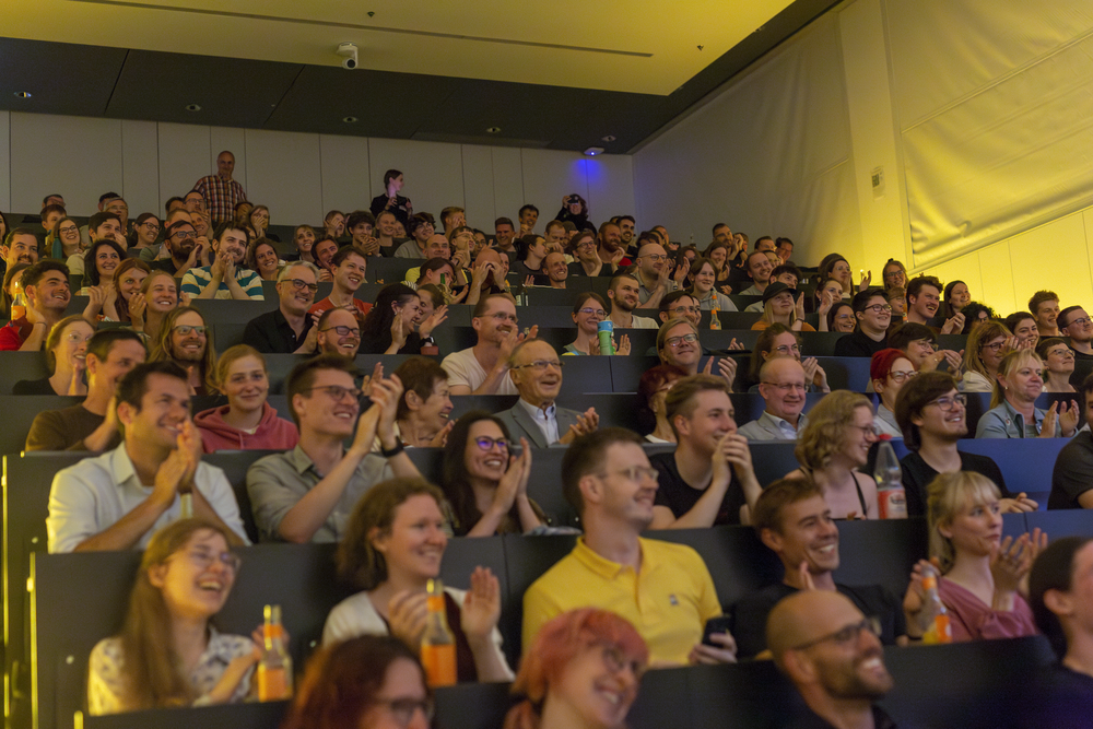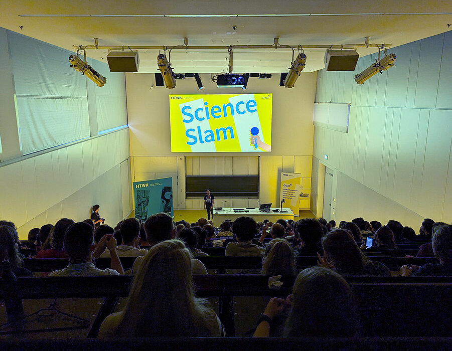 Am Abend fand der HTWK Science Slam statt, bei dem sechs Promovierende der Hochschule auf unterhaltsame und spannende Weise aus ihrer Forschung berichten. Neben dem wissenschaftlichen Inhalt zählten vor allem die Verständlichkeit und der Unterhaltungswert des Vortrags. Das begeisterte Publikum im vollen Hörsaal des Nieperbau applaudierte den Bauingenieur Maximilian Rohrer zum wohlverdienten Sieg.